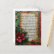 Une carte superposée avec du papier rouge texturé, des accents dorés, un motif de feuilles vertes et de la musique de feuille. Ornée de flocons de neige dorés, de baies rouges, de branches de pin et d'un ruban rouge aux bords à paillettes dorées, créant un thème de Noël festif.