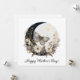 Profitez de ce beau papillon floral et de ce design de lune avec un texte de modèle Joyuse Fête des Mères en dessous. Modèles de photo et de ligne de signature au verso. Fleurs blanches avec feuilles argentées, papillon argenté et lune croissante noire.