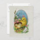Cette image vintage a deux poulets jaunes qui viennent d'éclos de leur oeuf jouant dans l'herbe et des fleurs roses et blanches. Elles sont encadrées dans un ovale soigné avec un arrière - plan du ciel. Le texte dit "voeux de Pâques". L'arrière - plan est blanc et crème tressé. Voir mon magasin Art by MAR pour apparier les produits avec ce design.