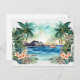 Envoyez vos salutations plus chaudes du paradis avec cette belle carte postale de paysage tropical aquarelle. Avec un océan serein, des palmiers, du sable et des fleurs tropicales dans les tons bleu ciel et marron, cette carte postale saisit l'essence d'un séjour balnéaire parfait. Le décor mystérieux est une scène de rêve, ce qui en fait un choix idéal pour partager des souvenirs de votre escapade sur la plage avec vos amis et votre famille.