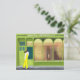 Une charmante carte postale d'une promenade tranquille au-delà d'une boutique verte.