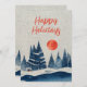 Carte de vacances avec dessin de Paysage hivernal Forêt Lune orange Bleu marine. Paysage hivernal calme enneigé avec forêt et Lune orange. Joyeuses fêtes dans un script tendance. Vous pouvez modifier le texte sur le devant et ajouter votre message au dos ou l'effacer.
