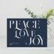 Elégante carte de Noël avec typographie chic paix amour joie en bleu et blanc.