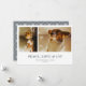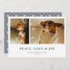 Capture d'écran Peace, Love & Joy, carte photo de vacances. Caractéristiques, 2 photo à l'avant, lignes de texte modèles pour votre salutation, nom et année, texte de salutation grise gelé tendance et coordination gris pâle derrière motif.