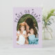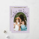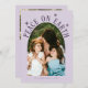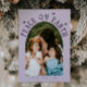 Elégante carte de vacances avec un texte qui dit "paix sur terre" avec des étoiles au-dessus de votre photo de cadre voûté. Ajoutez une autre photo au dos avec votre message. L'Arrière - plan est violet.