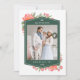 Elégante carte de vacances florale aquarelle présente votre photo verticale préférée encadrée par une bordure géométrique en vert chasseur, avec des fleurs de pivoines rouges peintes à la main, des bourgeons et de la verdure en haut et en bas. Personnalisez-vous avec votre nom de famille, vos salutations personnalisées et l'année.