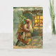 Carte de Noël victorienne de charme illustrant l'ancien monde Père Noël marchant à travers la neige apportant des jouets et un arbre aux enfants dans un cottage confortable.