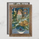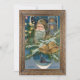 Charmante illustration de vacances de l'ère victorienne avec portrait du Père Noël traditionnel en robe marron avec une lanterne, pin enneigé, cloches en laiton et un ciel hivernal étoilé bleu profond avec texte Joyeux Noël dans une graphique de cadre en bois sculpté antique. Le dos présente une illustration complémentaire de houx et de cloches avec une zone vierge pour votre texte personnel.