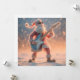 Une photographie amusante, fantaisiste et très détaillée ou un rendu 3D représentant une figure stylisée et duveteuse du Père Noël vêtu de son costume traditionnel rouge et blanc. Le Père Noël porte des lunettes de soleil foncées et frappe une pose dramatique de rock-and-roll tout en jouant avec enthousiasme une guitare électrique bleu clair et blanc. La scène est située à l'extérieur dans une forte tempête de neige, avec de gros flocons de neige doux tombant autour de lui. L'arrière-plan est flou avec une lumière chaude et dorée-orange émanant de l'horizon.