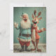 Une scène amusante et festive du Père Noël et de son renne partageant un grand rire, débordant de joie de Noël et de charme vintage. Le costume bleu vif du Père Noël et le nez rouge de Rudolph donnent vie à une énergie ludique des fêtes. Parfait pour les cartes joyeuses, les impressions festives et les cadeaux qui répandent des sourires et l'esprit de Noël partout.