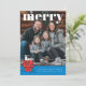 This customizable photo card is a perfect way to send festive cheer. It features a large full-bleed photo template and the bold word "merry" across the top. The card's bottom section has a vibrant blue banner where a classic Peanuts graphic shows Snoopy resting on his doghouse, which is decorated with Christmas lights. The banner includes customizable fields for the Family Name, individual signatures, and the Year. This design combines a recognizable Snoopy Christmas scene with a modern photo layout, making it a delightful holiday announcement.