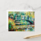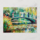 Peinture impressionniste de gens debout sur un pont de jardin au-dessus d'un étang, avec des nénuphars flottant en dessous dans des couleurs douces.
