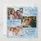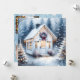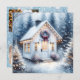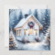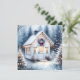 Carte de Noël personnalisée. Jolie maison blanche toute petite décorée de lumières de Noël, d'une couronne et entourée d'une forêt magique enchantée de merveilleux paysages hivernaux. Ajoutez votre salutation de vacances et vos photos de famille dans la zone personnalisée. Arrière - plan de flocon de neige bleu et blanc.