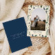 Une carte de vacances moderne votre photo préférée en forme d'arc avec un motif de feuilles de saint et de pin en vert et bleu marine. Personnalisez avec vos noms, photo et message inverse.