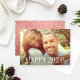 La carte de vœux de vacances moderne comporte votre photo de paysage avec une conception de superposition de texte Bonne Année 2024 avec un texte personnalisé et une bordure de formes de confettis. Le verso de la carte comporte une image de fond texturée de faux foil or rose avec un motif de confettis.
