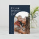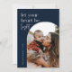 Carte de vœux avec citation de Noël en typographie moderne, 'laissez votre cœur être léger', cadre d'arche en bleu marine. Caractéristiques, espace de modèle pour votre message de vacances personnel au dos.