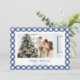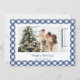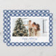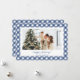 Carte de vacances photo plaid personnalisée bleu et blanc avec un motif à damiers bleu et blanc. Personnalisez facilement cette carte bleue en vichy photo de vacances avec votre photo et votre nom de famille.