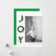 Envoyez une joie festive avec cette carte de fête religieuse/Noël propre et moderne avec votre photo de portrait préférée (les oeuvres en noir et blanc sont les meilleures) avec "JOY" en police moderne noire avec des feuilles d'aquarelle verte avec des taches de peinture noire entrelacées avec les lettres. Personnalisez avec votre signature en bas. L'arrière de la carte est en vert festif solide avec le verset de la Bible Romains 15:13 "Maintenant que le Dieu de l'espérance vous remplisse de joie et de paix dans la croyance" en blanc.