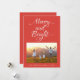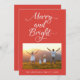 Élégante carte de vacances rouge avec "Merry and Bright" dans un style écriture blanche élégant, votre photo de famille préférée, et votre nom et l'année..