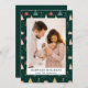 Envoyez des salutations de vacances à vos proches dans le style avec notre carte photo de Noël moderne dessiné à la main. La carte de voeux de vacances affiche votre photo encadrée en blanc avec un motif d'arbres de Noël dessinés à la main et des cadeaux dans une palette de couleurs vert, turquoise, rose, or & rouge. Personnalisez le devant en ajoutant un message d'accueil personnalisé et vos noms. La carte revient à un arrière - plan vert de forêt solide avec de l'espace pour un message personnalisé ou une autre photo.