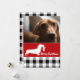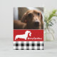 Plaid de Buffalo en noir et blanc et rouge festif brillant carte photo de vacances pour votre famille ou photo de vacances d'animal de compagnie préférée. Ce chien teckel mignon tient un bas avec un simple vœu de Joyeux Noël et est parfait pour les amoureux des chiens et les photos de famille. Le texte est entièrement modifiable, n'hésitez donc pas à ajouter votre propre message personnel.