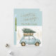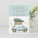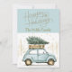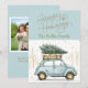 Vos amis et votre famille adoreront cette carte de vacances ancienne amusante avec une photo personnalisée au dos. Cette carte présente une voiture rétro amusante à l'aquarelle transportant un arbre avec des éclaboussures d'or et un joli fond bleu doux.