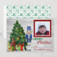 Ces cartes de Noël festives présentent un fond en bois gris rustique avec un arbre de Noël décoré, des cadeaux et un casse-noisette bleu délicieusement fantaisiste gardant les cadeaux ! Il y a un modèle pour votre photo préférée dans le coin supérieur droit. Le verso présente un motif de flocons de neige verts scintillants.