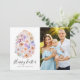Carte photo de Pâques simple et mignon avec des fleurs d'eau couleur rose rose poussiéreuses, pêche, bleu clair et violet, disposées en forme d'oeuf de Pâques. "Happy Easter" est affiché dans un script de calligraphie moderne avec vos noms ci-dessous. La carte de Pâques fleurie revient à un rose solide et poussiéreux arrière - plan avec de l'espace pour des textes et des images supplémentaires.