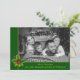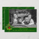 Votre photo en couleur sera automatiquement convertie en une image en noir et blanc élégant lors de son téléchargement dans cette conception moderne de carte photo de Noël propre. Votre photo de famille remplissant le visage de la carte derrière un cadre vert et or surligné d'une pince de pin et de houx. Le groupe inférieur tient vos noms et salutation de Noël dans une police verte douce. Or pétillant Joyeux motif de Noël sur le dos contre un vert foncé de Noël.