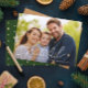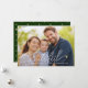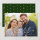 Carte de vacances photo simple et moderne avec le texte Reconnaissant dans une calligraphie élégante et tourbillonnante, avec votre nom, vos vœux et l'année en dessous. Au dos sont imprimés des points dorés et des étoiles sur un vert foncé de Noël.