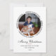 Une carte de Noël moderne avec des mots circulaires autour de votre photo préférée. Typographie en écriture et moderne. Le côté inverse est noir solide avec un motif étoilé.