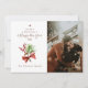 Elégante carte de vacances de Noël avec une photo et les voeux de Noël & Nouvel An dans un mélange de typographie classique et de script manuscrit, placé en forme d'arbre de Noël avec une étoile minuscule au-dessus. Le texte est de couleur chocolat. La carte est décorée d'un bouquet d'aquarelle de pin et de baies attachés avec un arc rouge. Voici votre nom de famille. L'inverse est composé d'un simple arrière - plan blanc avec un faux motif de branches d'or.