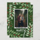 Un carte photo moderne Joyeux Noël en vert, rouge et blanc. Le design moderne et abstrait comprend des branches d'eucalyptus et des baies et sans serif pour la partie principale du texte. L'accueil est dans un script rustique moderne. Le dos comprend un motif eucalyptus vert et blanc.