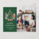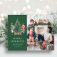 Carte postale de vacances Photo Moderne Vert. Cette carte postale de vacances unique et mignonne de joyeux Noël avec un casse-noisette représente des soldats jouets casse-noisette peints à l'aquarelle autour d'un bel arbre et un texte pour ajouter le nom de votre famille et l'année. Le verso comprend un texte pour personnaliser. Trouvez des articles assortis dans la Collection de Casse-Noisette de Noël.
