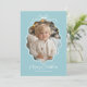 Carte de vacances photo rétro pastel bleu blanc ondulé. Un design moderne doux et simple avec des vibrations rétro. Affiché dans une palette de bleu clair et de blanc, mais TOUTES LES COULEURS SONT MODIFIABLES ! Choisissez de nouvelles couleurs pour compléter votre photo. La photo sera recadrée dans le cadre ondulé et contournée d'une bordure dessinée à la main et d'un nœud simple. "Joyeux Noël" est inclus en tant qu'élément de design. Personnalisez le modèle avec l'année et votre/vos nom(s). Le dos de la carte est orné d'un motif de nœud papillon sans fin. © Kimbellished, LLC