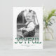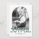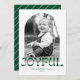 Joli carte photo de vacances avec votre photo verticale à l'intérieur d'une arche blanche. "Joyful" s'affiche en lettrage amusant et vert rétro avec votre nom et l'année ci-dessous. La carte de Noël rétro s'inverse pour afficher un motif à rayures en diagonale verte et blanche.