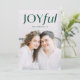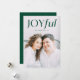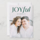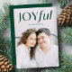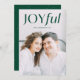 Carte photo de vacances simple "Joyful" affiché en lettres vert moderne. Personnalisez la carte de vacances moderne en ajoutant votre photo verticale, votre nom de famille et l'année. La carte inverse pour afficher des points blancs subtils sur un arrière - plan vert.