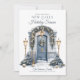 Photo We Moved New Home Christmas Holiday Card We're decking new halls for the Holidays Card. Christmas Moving Announcement photo Card. Favorite family photo on the back. Design features a watercolor front door in silver blue and gold hues decorated with pine wreaths and trees, snow, and lanterns. Holiday we moved and have a new address photo card.