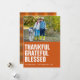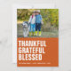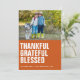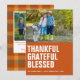 Carte de photo de Thanksgiving rustique, moderne et mignonne avec une photo en haut. Orange brûlé uni avec un texte blanc gras "reconnaissant, reconnaissant, béni" aligné à gauche. Personnalisez avec vos noms, l'année et un message de vacances (illustré avec "Joyeux Thanksgiving"), et ajoutez une photo supplémentaire et un message personnel au verso si vous le souhaitez. Envoyez-moi un message si vous avez besoin d'aide ou si vous avez des demandes spéciales.