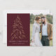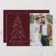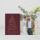 Carte de vacances moderne et élégante avec votre photo complétée par un faux pin à feuille d'or enneigé avec un arrière - plan bordeaux (ou couleur de votre choix). "Joyeux Noël" est affiché dans une police serif blanche et moderne avec votre nom ou texte personnalisé ci-dessous. La carte de vacances photo inverse pour afficher trois pins dorés avec votre message personnalisé ci-dessous en texte blanc. Ce design est parfait pour utiliser comme carte de Noël familiale ou carte de vacances d'entreprise ou d'affaires.
