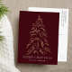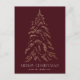 Carte postale de vacances moderne et élégante, avec un pin d'arbre à feuille d'or en faux neige et un arrière - plan bordeaux (ou la couleur de votre choix). "Joyeux Noël" est affiché dans une police serif blanche et moderne avec votre nom ou texte personnalisé ci-dessous. La carte de vacances non photo s'inverse pour afficher votre adresse de retour et votre message personnalisé. Ce design est parfait pour utiliser comme carte de Noël familiale ou carte de vacances d'entreprise ou d'affaires.