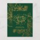 Pin Vert Moderne Bough Floral Élégant Gold Script Carte de vacances. Envoyez des salutations de vacances personnalisables et personnalisées à vos amis, vos collègues et votre famille avec ces cartes de style moderne et élégant non photo design festif, minimaliste naturel! Un beau feuillage doré fleuri avec agrumes, cannelle, cloches de Noël, cadre d'art de la ligne des feuilles de saint et de pin autour des salutations de vacances "Joyeux et lumineux" en calligraphie élégante. En bas, affiche votre message de bienvenue personnalisé de votre nom de famille dans la typographie moderne