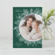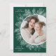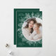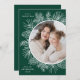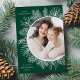 Elégante carte de vacances avec votre photo encerclée de pinecones blancs, pics de pin, et feuillage d'hiver avec un arrière - plan vert. Le carte photo de vacances botanique vous propose un accueil personnalisé, le nom de famille et l'année en lettres blanches. Ajoutez votre message personnalisé au dos de la carte ou laissez vide.