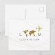 Une carte postale chic pour écrire sur les voyages... avec un nom monogrammé, une carte fausse or (couleur ocher) du monde et un avion, avec quelques lignes très pâles et minces le long de l'arrière - plan blanc