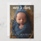 Quelle meilleure façon d'apporter de la joie à vos amis et à votre famille qu'une photo de votre nouveau-né sur votre carte de Noël de famille. Cette carte vous permet d'ajouter une photo et, en haut, il est écrit "plus à applaudir" dans une police de calligraphie. Il y a un endroit où vous pouvez ajouter un message en bas. Au dos de la carte, il y a un motif à rayures marines et blanches.