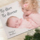 Plus le nouveau bébé faire-part pour la saison des fêtes avec le texte de script gris traditionnel. Modèle photo via Pixabay sous licence CC0 et doit être remplacé par votre propre photo