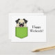 Illustration d'un mignon chiot carlin qui pend sur la poche verte. Cette adorable conception de chien carlin est une idée cadeau pour les amoureux de les chiens, maman de fourrure, papa de fourrure, amoureux des animaux de compagnie et amoureux des animaux. Personnalisez ou customisez cette carte postale de vacances en ajoutant votre propre texte.