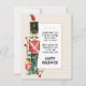 Conception à l'aquarelle avec un soldat jouet nostalgique portant un uniforme rouge et un chapeau noir haut avec une plume rouge debout parmi des boules de décoration de Noël rayées et de la verdure des fêtes avec des baies rouges. Le poème original sur le devant est modifiable - faites-le vôtre ! Le texte se lit comme suit "Les jouets de Noël et les jeux animés sont des moyens charmants de jouer, mais je sais que ma plus grande joie c'est toi ce jour de Noël. Joyuses Fêtes !" Le dos de la carte comporte des ornements et de la verdure dans les coins et dispose d'un espace pour que vous puissiez écrire votre message personnalisé et signer votre nom.