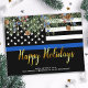 Envoyez des voeux de Noël Joyeux à vos amis, votre famille, vos collègues services de police et votre communauté avec cette carte de Noël Joyeuse Police de Ligne Bleue - American Flag aux couleurs du drapeau de la police, noir et bleu moderne avec des feuilles saints et des baies et élégant script d'or. Personnalisez avec votre message et nom de famille ou service de police. Ces cartes de Noël de la police sont parfaites pour les familles policières et policières ainsi que pour les services de police. DROIT D'AUTEUR © 2020 Judy Burrows, Black Dog Art - Tous droits réservés. Police Noël Joyeux Vacances Mince Ligne Bleue Carte postale