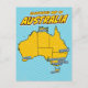 Cette carte illustrée de l'Australie est rendue dans un style pop art dynamique. La carte est dessinée en noir et remplie d'une couleur jaune vif, placée contre un arrière - plan bleu avec un motif pointillé. Les principales villes d'Australie sont étiquetées en boîtes bleues